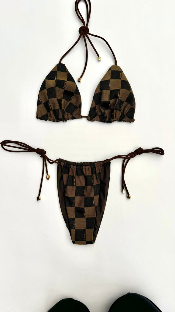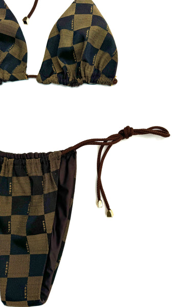 Upcycled from a pair of Fendi checked jeans - now triangle bikini lined with lycra suitable for the water